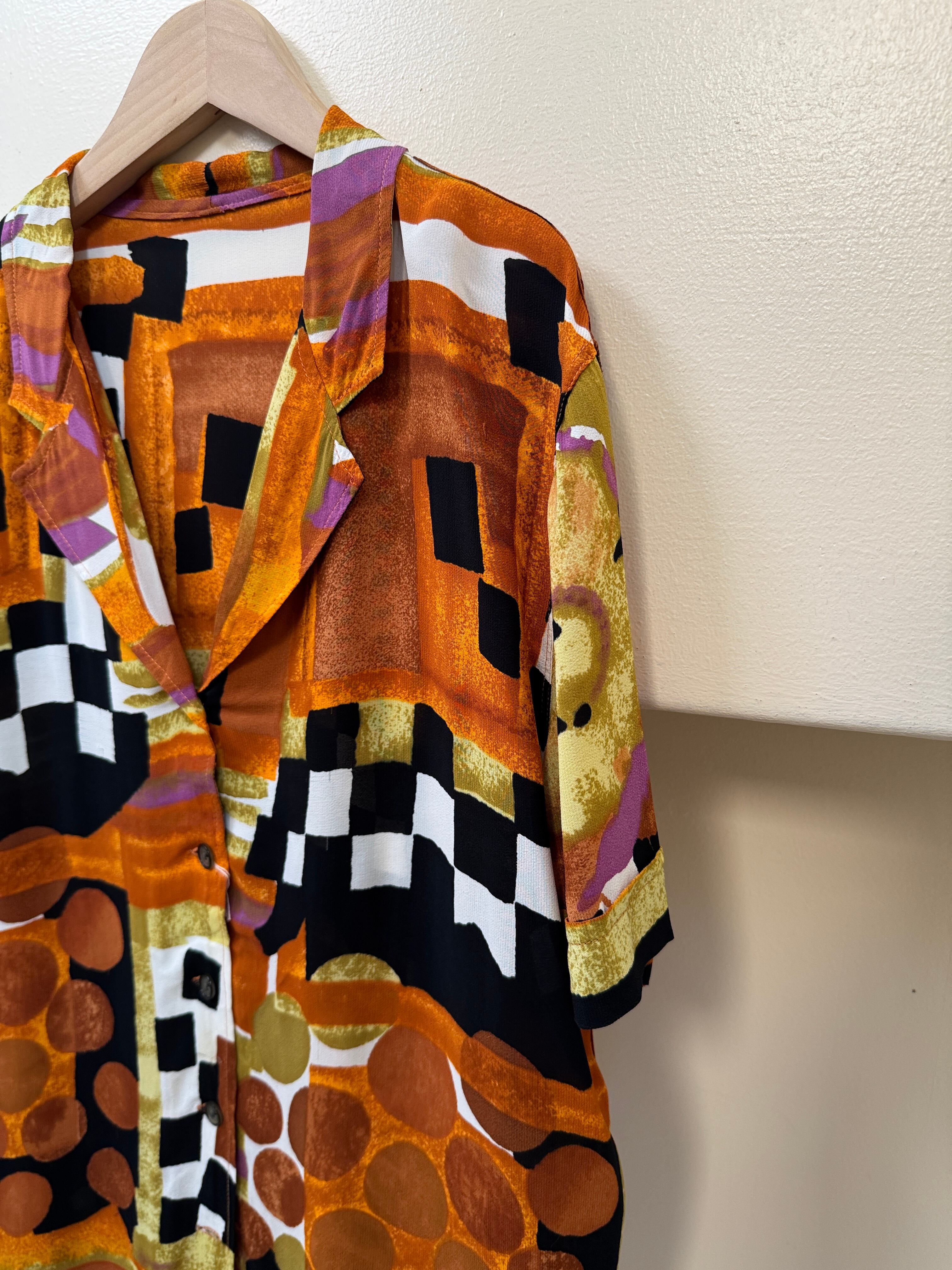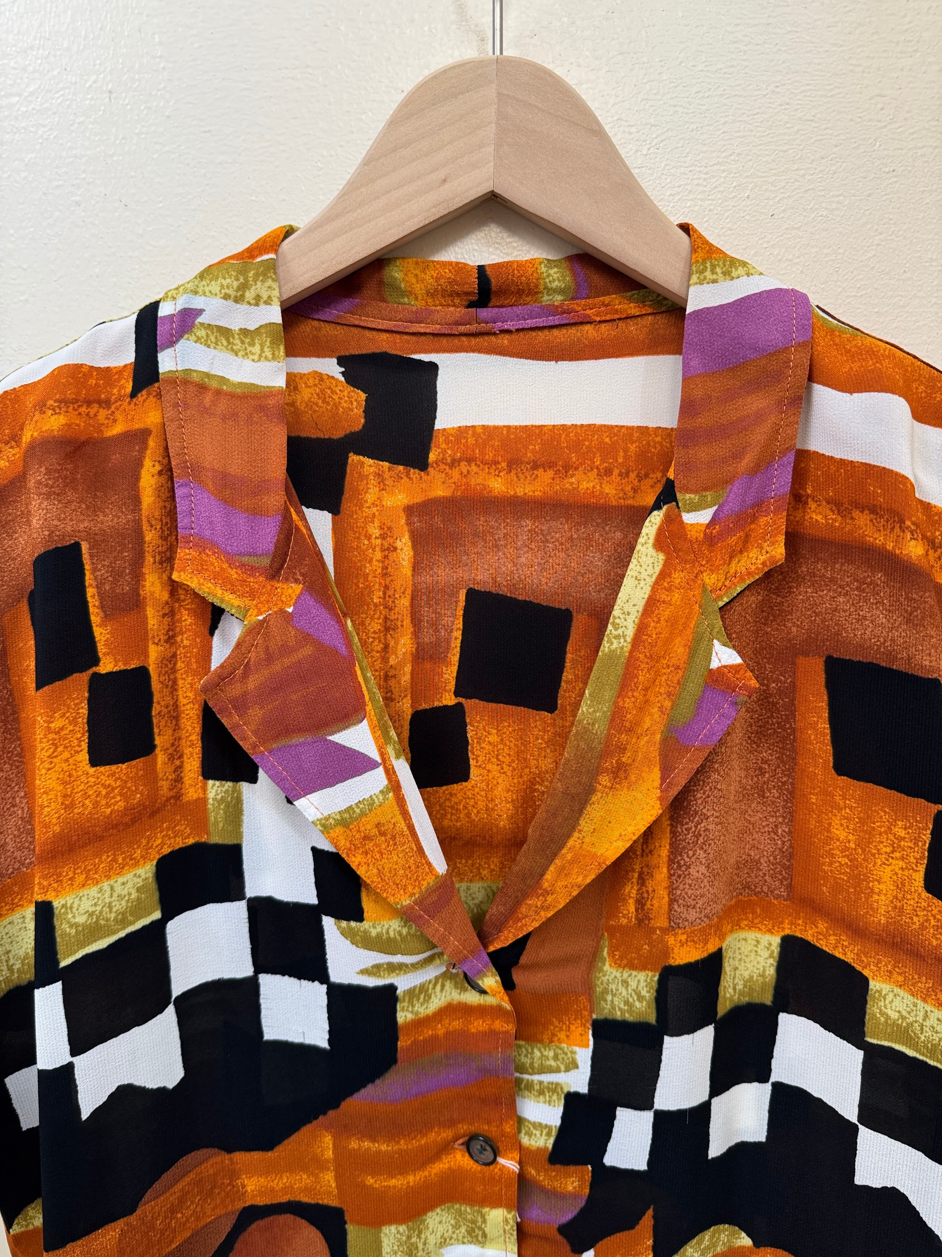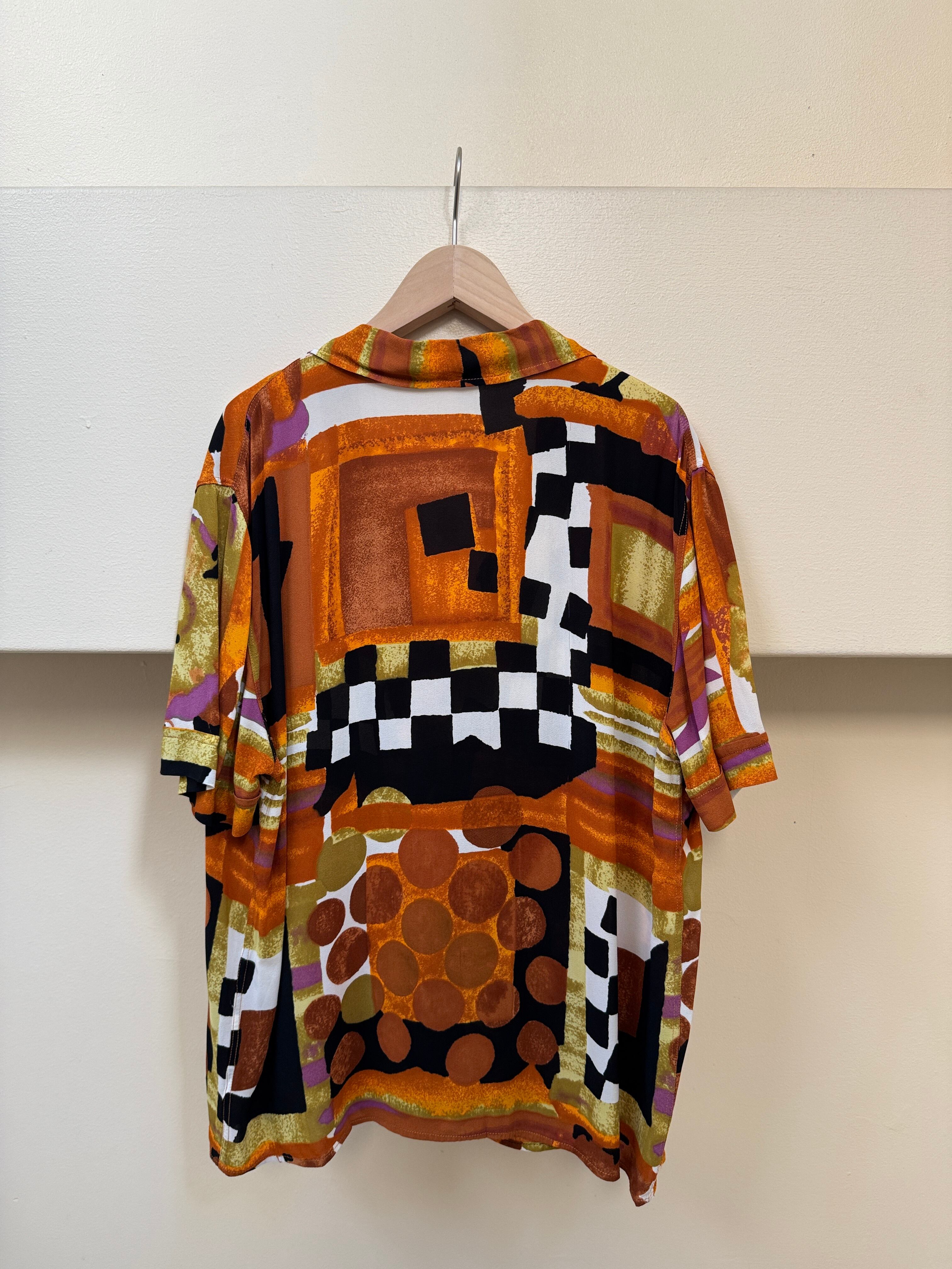 オレンジやブラウンをベースに、幾何学模様が組み合わさったアート感なシャツです。