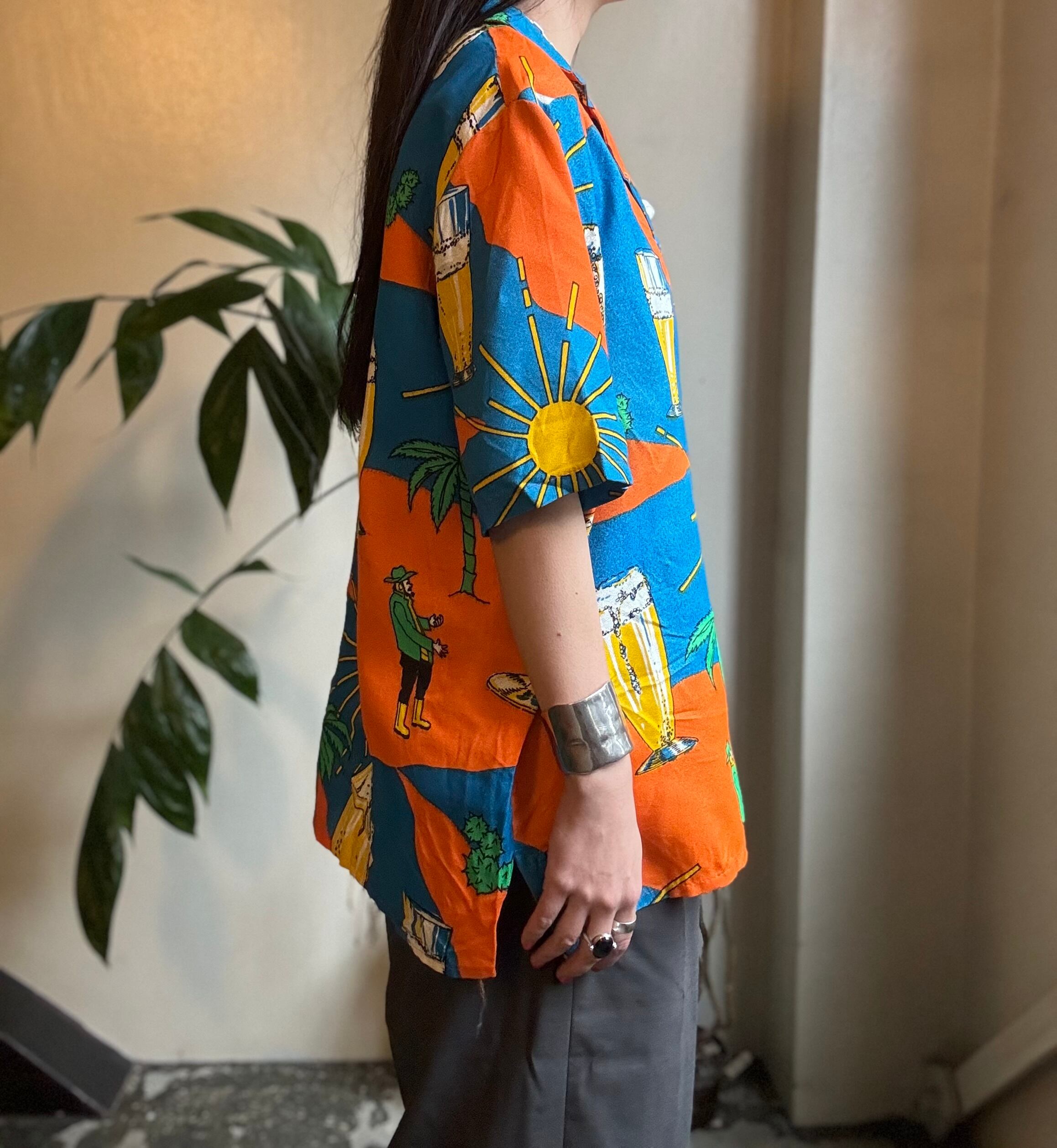 ビール好きや太陽好きにぴったりの柄入り半袖シャツです。何度見ても楽しめる、ユニークなデザインが目を引きます。